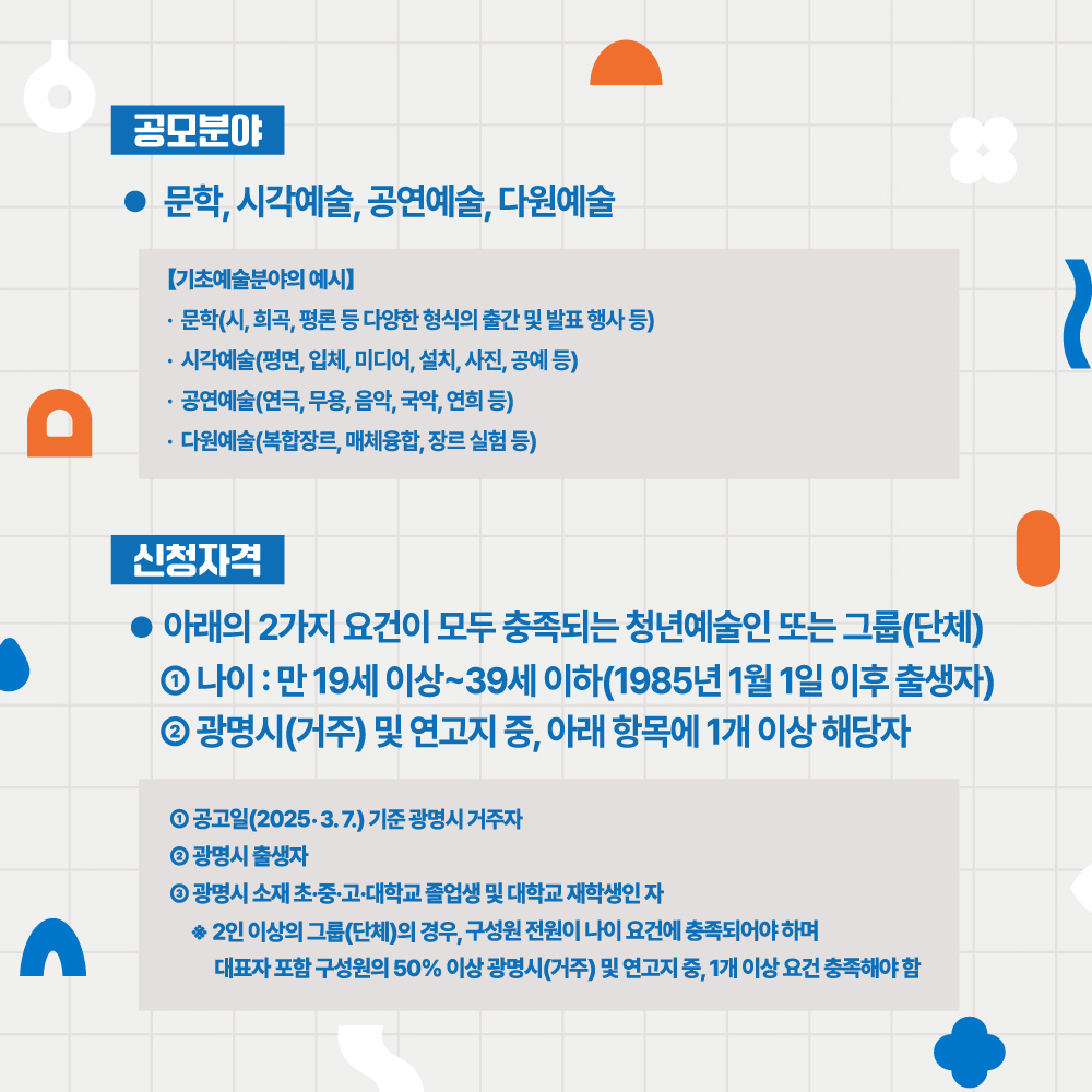 ○ 신청 방법: 광명문화재단 누리집(www.gmcf.or.kr) 공고 내 지원서 양식 작성 후 이메일 제출(gmcf0414_@naver.com)
